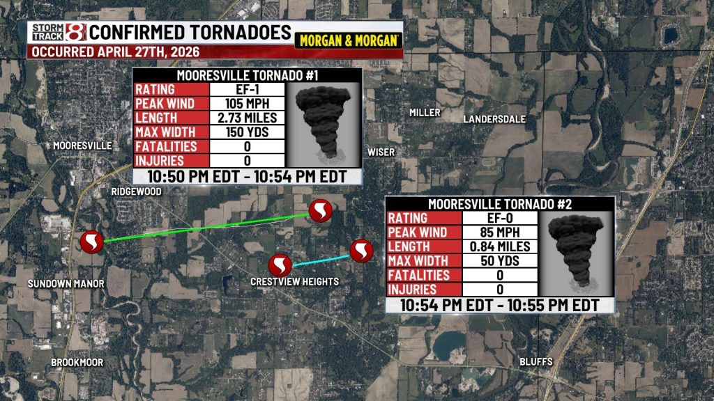 The first hit at 10:50 p.m. Monday south of Mooresville with winds up to 105 mph, rating it moderate, or an EF-1 on the enhanced Fujita scale. It traveled 2.73 miles and had a maximum width of 150 yards. It lasted about 4 minutes.