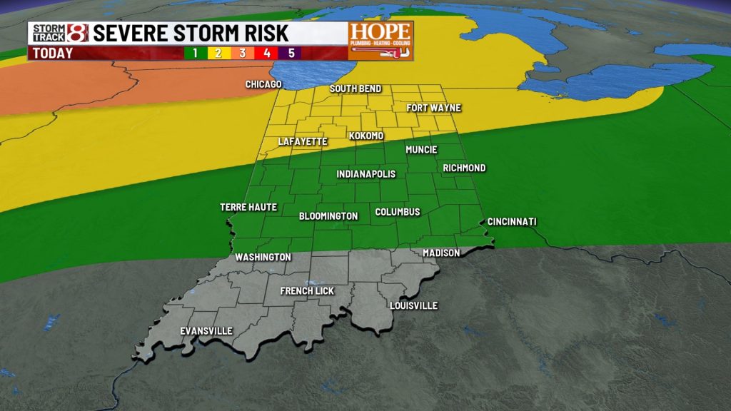 Attention will turn to scattered thunderstorms developing later in the day. The main focus area will be across central and north-central portions of the state late this afternoon into the evening hours. Any storms that develop could be strong to severe, with damaging winds and large hail as the primary threats. Isolated tornadoes cannot be ruled out. The northern third of the state is under a Level 2 out of 5 risk for severe weather, while much of central Indiana is in a Level 1 out of 5 risk.