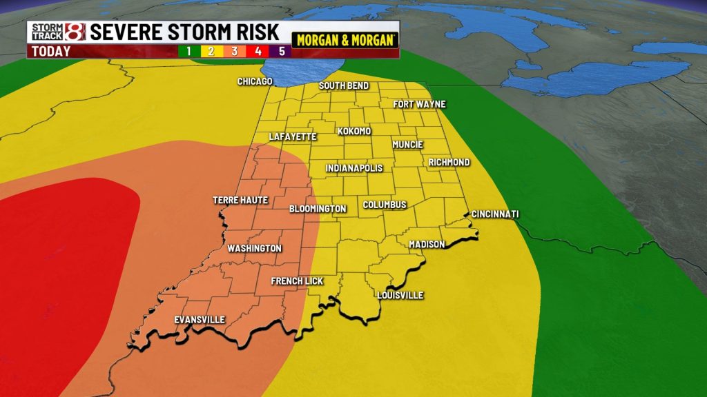 Strong to severe storms with heavy rain will move south after midnight. Storms during the evening could produce damaging wind, isolated tornadoes, and even flooding.  Total rainfall may range from 1/2” to over 2”. Lows will be in the 50s.